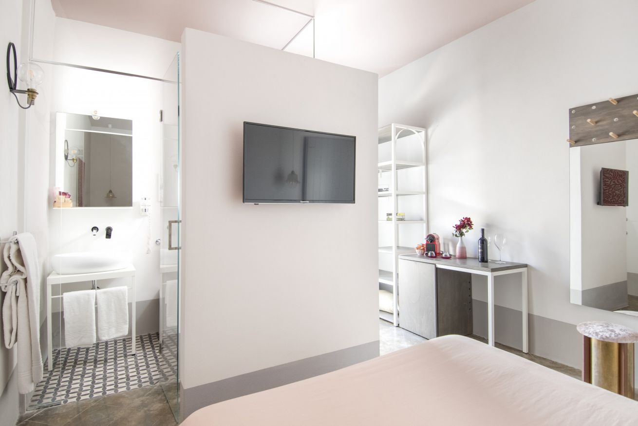 In Via Largo Forno Romano 10, a Monopoli, Fico Poppyred è una luminosa camera che ti accoglie con toni delicati e un'atmosfera rilassante, situata al secondo piano dei Fico Apartments, accessibile tramite scala interna.
